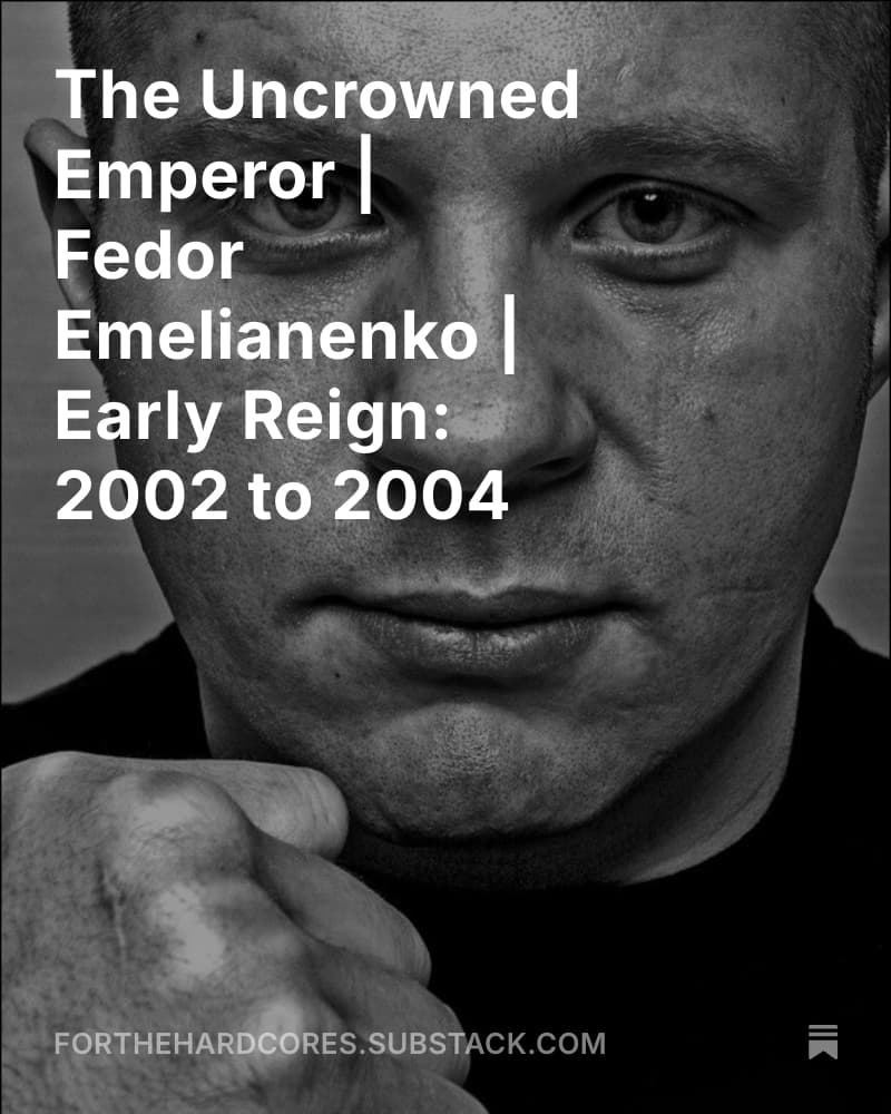 When Fedor met Antonio Nogueira at PRIDE 25 in March of 2003, Big Nog was already becoming a legendary fighter himself. He was 7-0 in the organization with six stoppages, the PRIDE Heavyweight Champion, the number one heavyweight on the planet, and the number one pound for pound fighter in the world. Nogueira had also won 12 fights in a row, dating back to February of 2000. He was known for his mastery of Jiu Jitsu and array of ground techniques, his durability, and extraordinary ability to come back and win fights he seemingly had no business winning. He was coming off recent wins over Dan Henderson and Semmy Schilt, and looking to defend his heavyweight belt. In walks Fedor Emelianenko. Fedor was seen as a legitimate threat by hardcore fans as a new generation talent, and saw his sambo style as a good counter to Big Nogâs patented attacks. Although most people thought he would have to keep the fight standing to have the best shot at taking out Big Nog. Yeah, that didnât happen. The opening bell saw Fedor gliding across the ring throwing a whipping right hand, and shooting his hips straight into a takedown. All of the first round was spent on the ground, with Fedor landing good shots on Nogueira, and avoiding any submission threats. Although Big Nog was the comeback king, the remainder of the fight looked just like the first round, and this was not a contest Nogueira would come back to win. Fedor shocked the world not by beating Nog - but by the way in which he did so. Not only did he defend all of Antonioâs submission attempts effectively â he seemed to intentionally leave his limbs in certain danger, seemingly dismissive and in defiance of the skills Nogueira was bringing to the table. A modern analogy would be like intentionally giving your back to Charles Oliveira, just to escape his rear naked choke easily and rain down elbows. That was the first time weâve ever saw Nogueira defeated this way â Fedor landed crushing blow after crushing blow time and time again from full guard, half guard and side control. He was awarded a unanimous decision victory and walked away the PRIDE Heavyweight Champion. A new era was upon us.