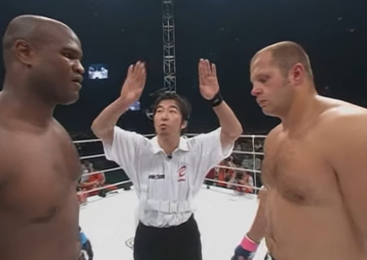 This fight was a title eliminator, with the winner advancing to fight Antonio Nogueira for the Heavyweight Championship. Although Heath was ranked at number 11 coming into this fight, I think he was much better than that ranking would suggest. He had recently lost a title fight to Big Nog, but rattled off two straight wins over Kochkine and Vovchanchyn. Although he was well known for his ground game, he developed improved striking over the years. When he met Fedor at PRIDE 23, none of that mattered. Herring was dominated so thoroughly that within three minutes of the opening bell, the cageside physician was coming in to check the swelling on Heathâs right eye. Heath opened the fight with a teep, which was met by an immediate takedown from Fedor. While Herring briefly attempted a kneebar and eventually reversed position after Fedor lost back control, Fedor spent virtually the entire first round pummeling Heath from top â full guard, half guard, side control. The swelling on Heathâs right eye proved to be too much for the doctor to allow, as the fight was stopped in between the first and second round.